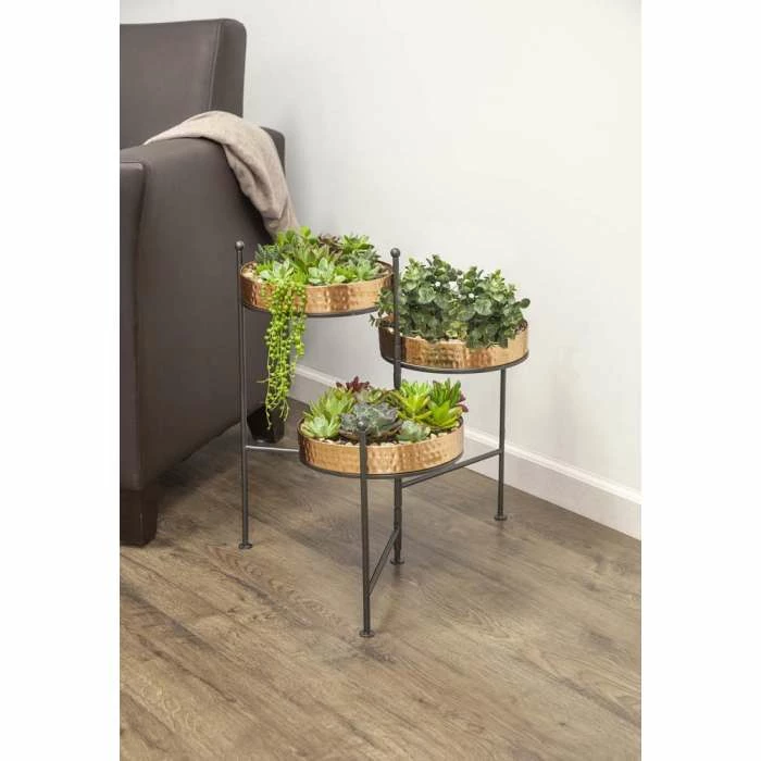 Bring an artistic feel to any room or garden with this 3 tier hammered copper finish plant stand. This timeless piece will dazzle any set of eyes with the textured finish for a rustic contemporary appearance alongside tubular steel for a hardy piece. Made from galvanised powder-coated steel to keep rust and wear at bay.