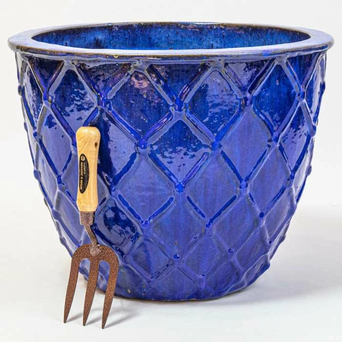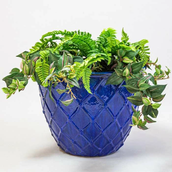 This deeply appealing glazed dark blue planter is strikingly stylish and a wonderful way of showcasing your favourite plants. Its pattern helps make the planter a decorative feature in its own right, and provides a perfect visual foundation for tall shrubs or plants with long stems. Ceramics are fired in a high temperature kiln, helping to reduce porousness and vulnerability to the elements, making it a terrific material for a planter, while drainage holes help prevent overwatering.