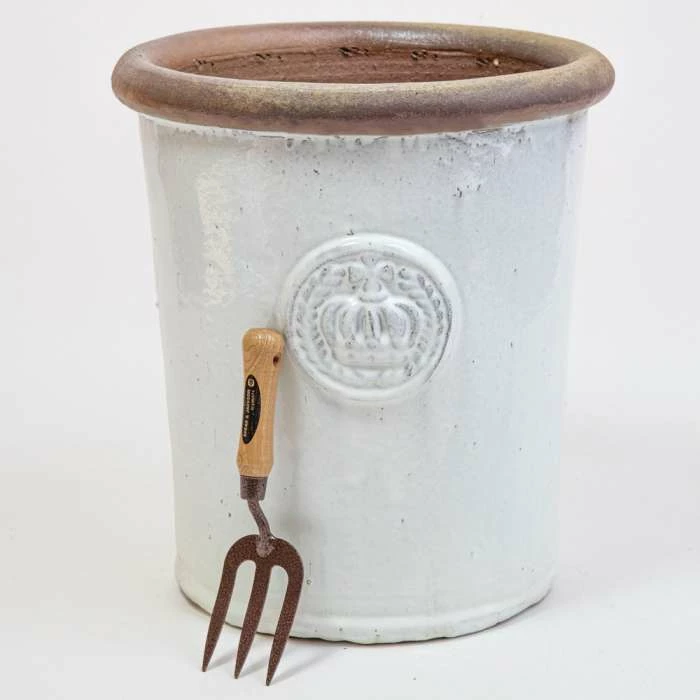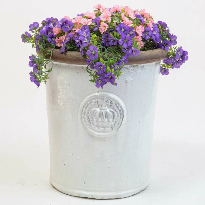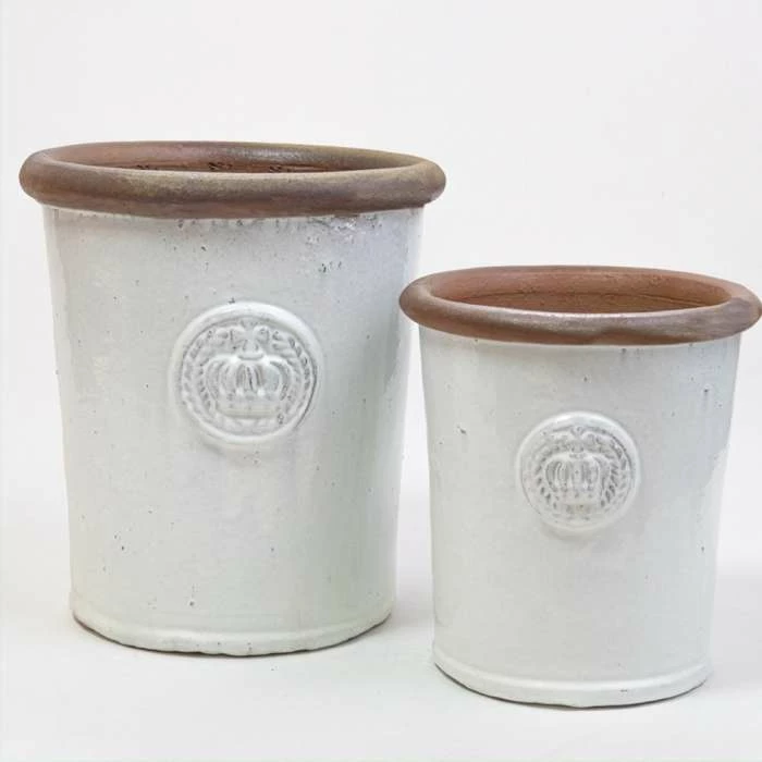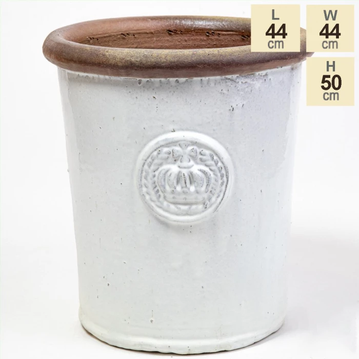 This white rimmed stoneware planter is the pinnacle of taste and a wonderful way of showcasing your plantlife. Its design is confidently attractive and features embossed heraldic crown emblems, which help create a uniquely cultivated aesthetic. Drainage holes also help prevent unhelpful overwatering. The planter’s tastefully muted colouring emphasises the visual qualities of your plants, whether you’re growing an ornamental herb, decorative fern or miniature alpine garden.